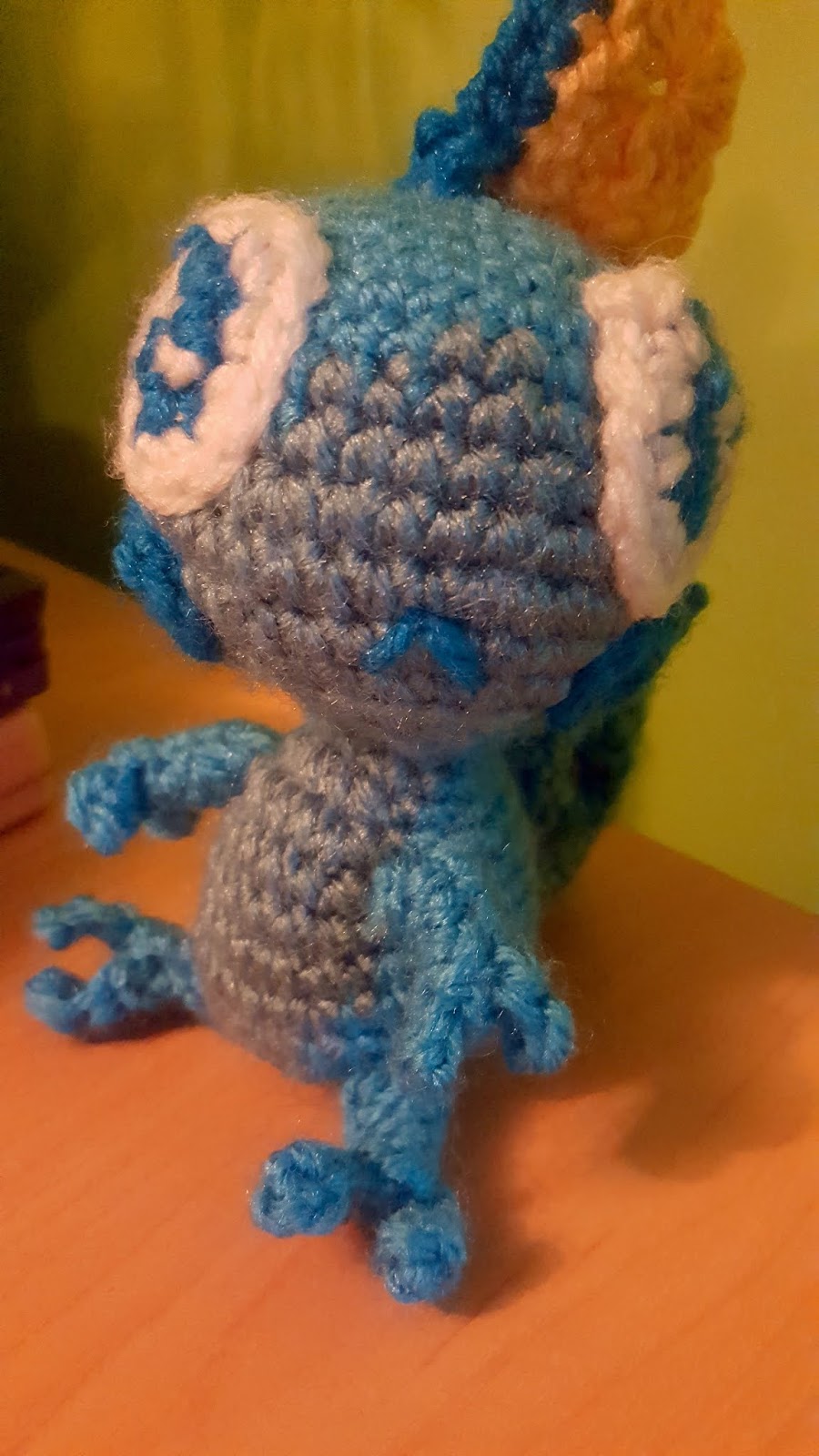 He's very cute and I love him very much!! But there's still a few adjustments I'd like to make before sharing the pattern! For one, the "light blue" I got is a lot closer to grey than I thought. It's called Country Blue from Red Heart Super Saver. Still a nice colour, but not quite what I need for this little guy. So I'm ordering some more yarn, this time a colour actually called "Light Blue" that should come in next week (hopefully)! I also want to adjust the eyes. They seem a little too big for the face. I might try just making white circles and embroidering in the blue irises. I dunno, embroidery is still kinda new to me. I tried making a more complicated mouth with the embroidery but I had soooo much trouble...I ended up just making the little upside-down v mouth. I still think that's really cute, so I might actually leave it that way.